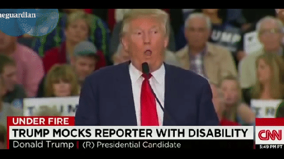 El mundo ENTERO entiende por qué el segundo gif es increíblemente ofensivo. A nadie se le ocurriría defender a este señor por mofarse públicamente de un reportero con una condición congénita que afecta sus articulaciones. Nadie diría «ay, qué exagerados» y trataría de justificarlo como un chiste. De hecho, nadie dijo «qué gracioso es Donald Trump» en ese momento. NADIE. La condena fue súbita y unánime. ¿Por qué, entonces, todavía estamos tratando de sostener que con los gays es una broma? ¿En qué se diferencia el gif número 1 del número 2? En nada, señora. Es. Lo. Mismo.